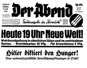 Ausgabe vom 19.7.1932 beschäftigt sich mit der Politik und Verbrechen der Nationalsozialisten.